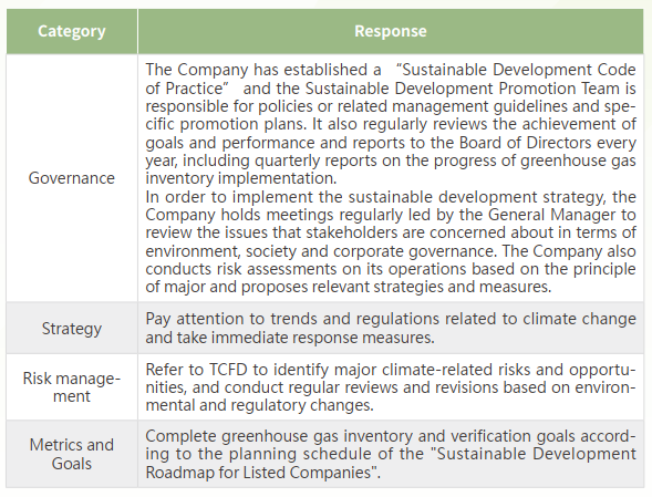 The Company follows the “Recommendations of the Task Force on Climate-related Financial Disclosures (TCFD)” framework released by the Financial Stability Board (FSB) in June 2017, and continues to identify climate risks and opportunities in the value chain. Based on this, it plans response measures and demonstrates the governance and strategies adopted for the issue of climate change.