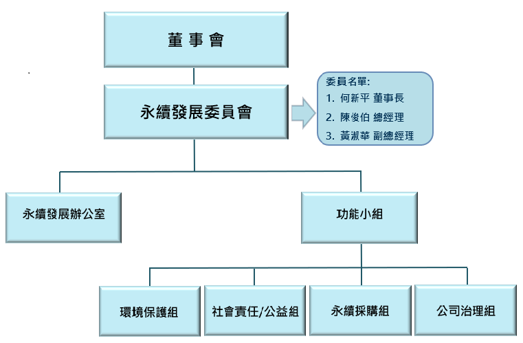 | 董事會 | 為永續發展最高指導單位,負責審視與決策永續相關重大事項。 |