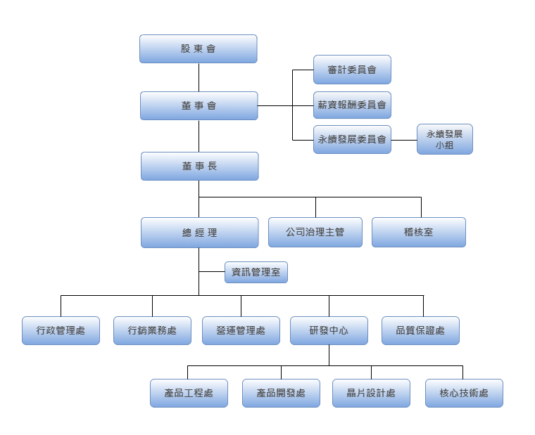 總經理室 1. 協助董事長處理公司業務之執行與協調。 2. 規劃公司中、長期營運策略、經營績效評估。 3. 新事業開發之策略規劃與執行。 4. 推動產能提升及營運策略執行。 5. 任命品質管理系統管理代表。